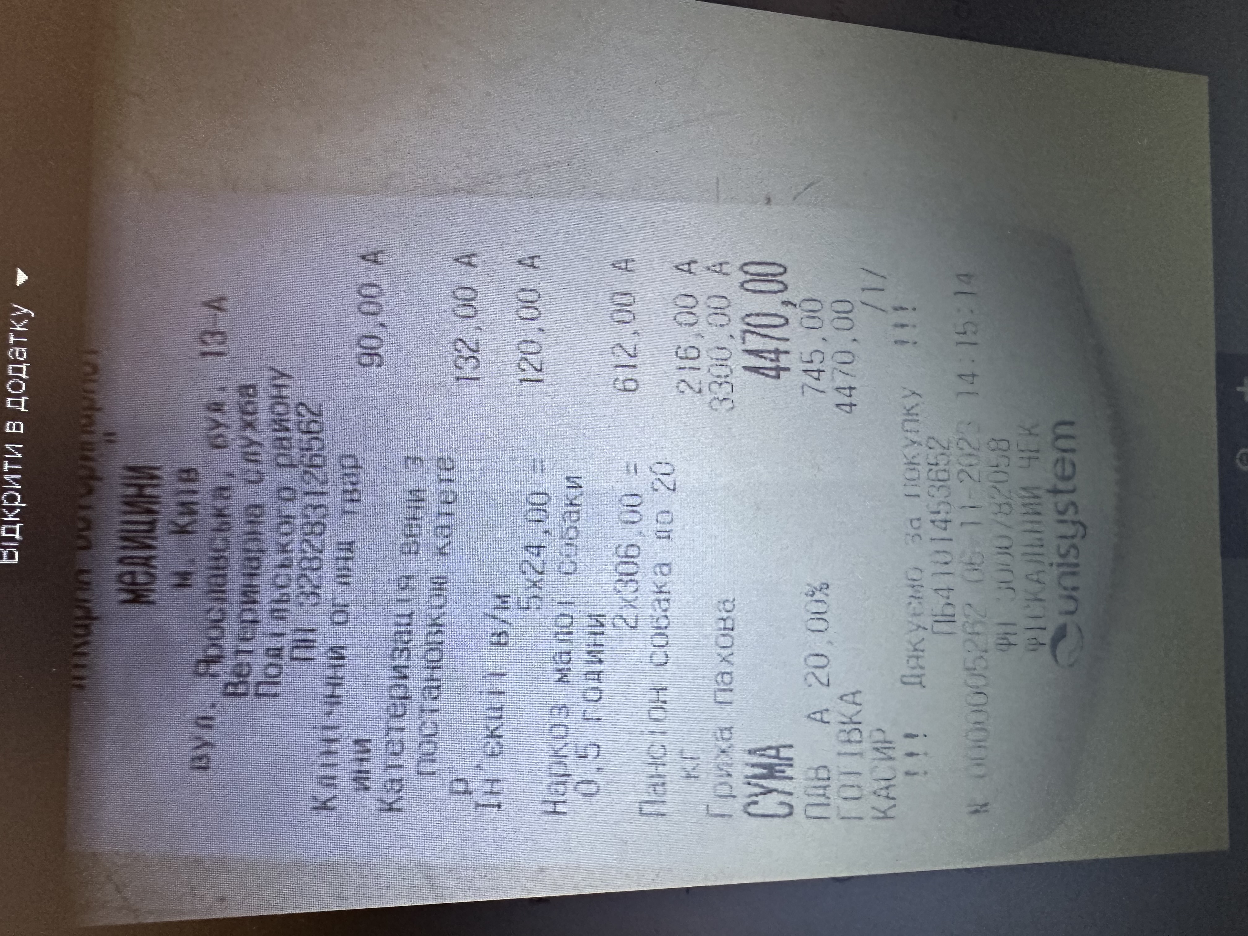Dank Ihrer Unterstützung unseres Projekts konnten wir die Behandlung des Hundes in der Ukraine bezahlen.Die Hunde wurden einer Notoperation unterzogen, um den Leistenbruch zu entfernen. Die Behandlung umfasst eine allgemeine und biochemische Blutanalyse, Ultraschall der Bauchhöhle und Echokardiographie.Die Behandlungskosten beinhalten in UAH:1. Klinische Untersuchung des Tieres 90,00 2. Katheterisierung einer Vene - 132,003. Injektionen - 120,004. Narkose - 612,005. Unter Aufsicht den Hund im Krankenhaus finden - 216,006. Leistenbruch - 3300,007. Allgemeine Blutanalyse - 174,008. Biochemie - 528,009. Entnahme einer Blutprobe - 108,00Danke schön!Dank der rechtzeitigen Behandlung erhielt der Hund eine Chance auf ein glückliches, schmerzfreies Leben.Hier finden Sie die Rechnungen: