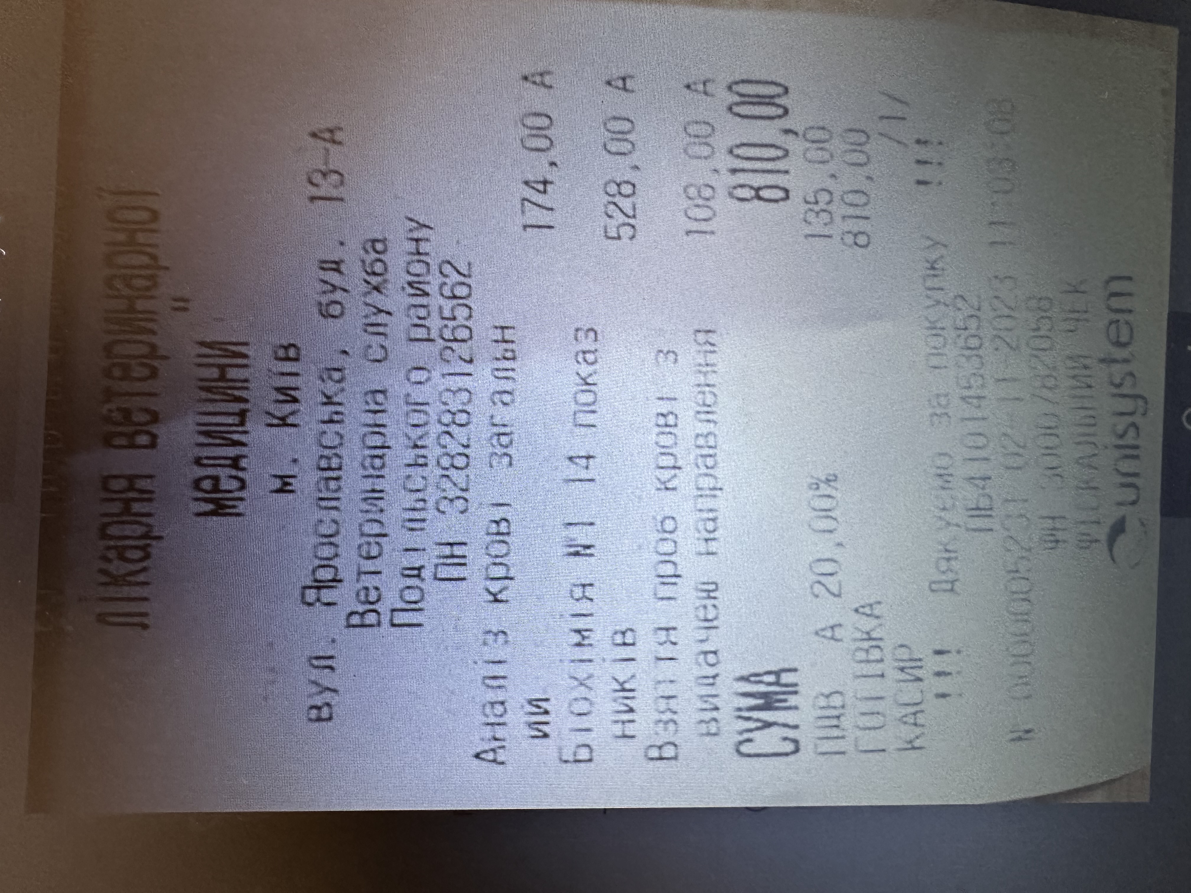 Завдяки вашій підтримці нашого проекту ми змогли оплатити лікування собаки в Україні.Собаці екстрено прооперували видалення грижі. Лікування включає загальний та біохімічний аналіз крові, УЗД органів черевної порожнини та ехокардіографію.У вартість лікування в гривнях входить:1. Клінічний огляд тварини 90,00 2. Катетеризація вени - 132,003. Ін'єкції- 120,004. Анестезія- 612,005. Перебування собаки в лікарні під наглядом - 216,006. Пахова грижа- 3300,007. Загальний аналіз крові - 174,008. Біохімія- 528,009. Взяття зразка крові - 108,00
